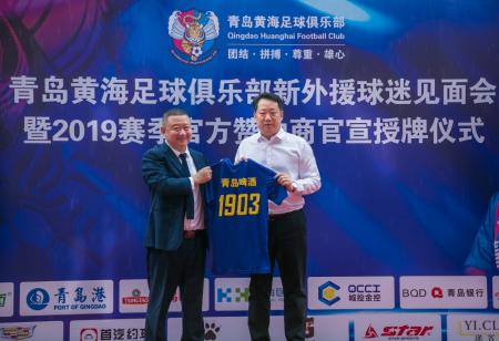 在活动中,青岛黄海足球俱乐部主席张青为青岛啤酒等俱乐部2019赛季赞助商嘉宾与代表,颁发了纪念牌匾与纪念球衣。青岛啤酒营销总裁蔡志伟出席活动,并回赠青岛啤酒冠军杯,为青岛队冲超举杯加油。