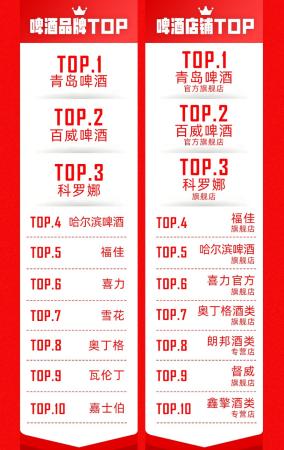 在啤酒品牌TOP10榜单、啤酒店铺TOP10榜单中,青岛啤酒均位列第一。