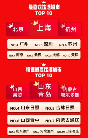战报显示,上海、北京、杭州位列“最喜欢饮酒城市”前三席。而增速最高饮酒城市则被青岛夺得。