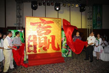 青岛啤酒股份有限公司副总裁兼制造中心总裁樊伟、供应商代表崂山玻璃有限公司董事长董中启、崂山区人大常委会主任张晋鲁、青啤五公司总经理张百川共同开启10周年纪念造型金砖