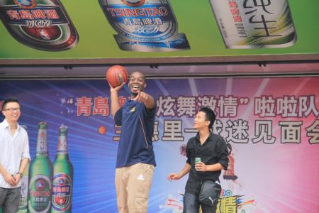 在现场最为吸引眼球的是来自NBA的球星“神鸟”兰德里与现场球迷罚球PK,为了“公平”起见,兰德里只能投4次,而球迷则有6次机会。尽管如此,“神鸟”还是技压群雄。