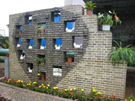 回收的硅藻土制砖搭建的环保墙上,集中展示了青岛啤酒变废为宝的各种产品