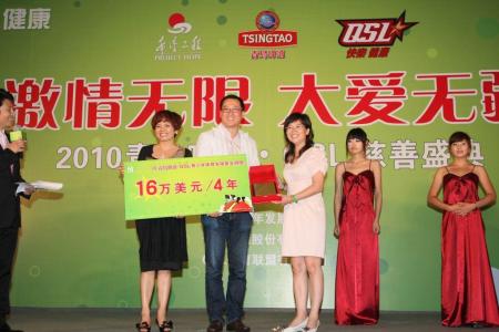 据悉,2010青岛啤酒•QSL慈善盛典由青岛啤酒股份有限公司、中国青少年发展基金会及QSL体育联盟有限公司联合主办,旨在关注青少年体育事业发展,提高广大青少年健康体魄,成就青少年体育发展梦想。慈善盛典当天,通过捐款、慈善拍卖等形式共募集善款高达1294.8万元,这些钱将用于推动贫困地区青少年体育事业的蓬勃、持续发展,为贫困小学设置爱心体育园地设施使用。