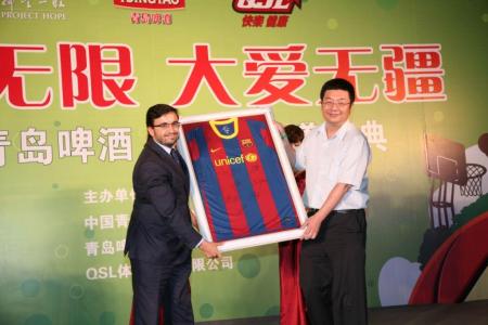 慈善盛典上,青岛啤酒率先捐赠273万元善款,据悉,这是青岛啤酒继2009年9月创建青岛啤酒•QSL青少年体育发展基金、注入启动资金273 万元后的第二笔捐款。随后,众多青岛啤酒经销商也纷纷慷慨解囊,彰显了青岛啤酒“大家庭”对“社会价值永远高于企业价值”理念的高度认同和不懈追求。在盛典现场爱心如潮涌动氛围的感染下,黄健华、穆托姆博、郑海霞、刀郎、马艳丽、本山传媒王小虎等嘉宾悉数献出珍藏的物品作为拍卖品,为贫困地区青少年体育发展事业贡献力量。