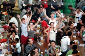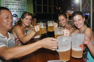 “这是我们新认识的外国朋友,虽然听不懂他们说什么,但一起干上一杯青岛啤酒就是好兄弟。”昨天下午5时,在青啤大世界靠近中心舞台的位置,记者发现了一队奇怪组合:两个金发蓝眼睛的外国朋友和四个中国小伙子,一边手舞足蹈比划着,一边干着手中的青啤,一桌人说着不同的语言,却喝的十分热闹。